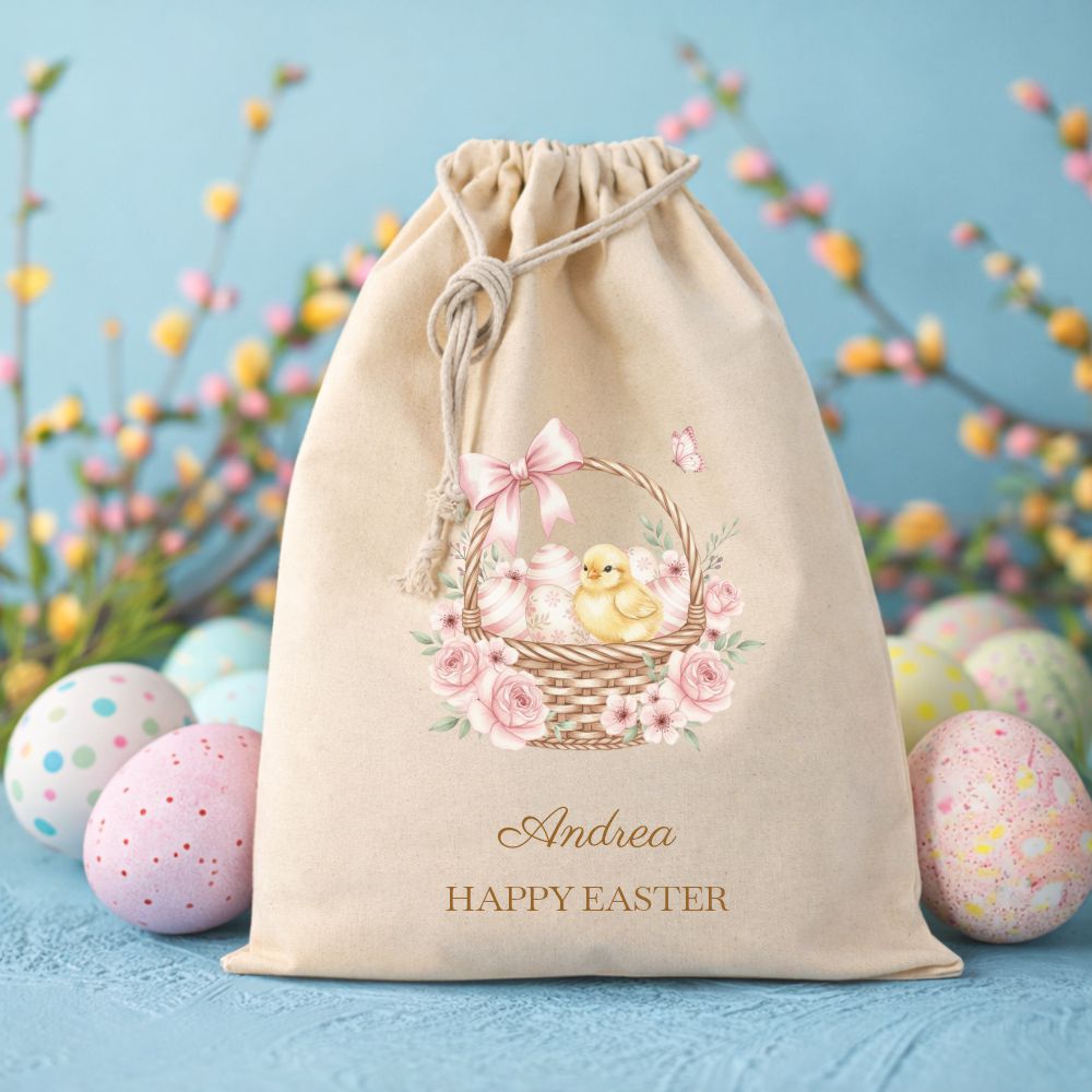 • Personalizirana poklon vreća s nježnim uskrsnim motivom (zečići, pisanice, cvijeće,pilići…)