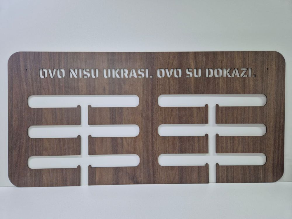 Ovaj elegantni stalak držač nosač za medalje izrađen je od visokokvalitetnog HDF materijala debljine 3 mm, što osigurava dugovječnost i čvrstoću. Idealno je rješenje za organiziranje i izlaganje vaših sportskih medalja. Na stalaku je ugravirana motivacijska poruka koja inspirira i podsjeća na trud, rad i uspjeh.